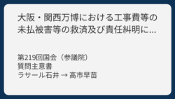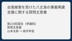 3行解説POINT八丈島で台風被害を受けた事業者をどう支援するかについて、山本太郎議員が政府に質問し、内閣総理大臣 高市早苗が答えました。山本太郎議員は、被災した事業者への二重ローン救済策や、返済不要の給付金の実施状況と政府の方針について尋...