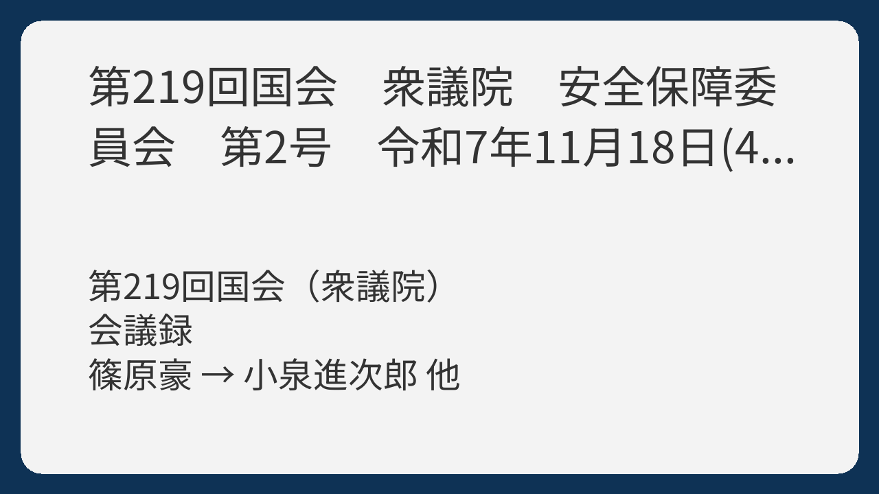 - 小泉大臣: 「あらゆる選択肢を排除せずに議論する」という姿勢を繰り返し、検討の必要性を訴えるに留まりました。質問者が求めた「明確な導入理由」や「日本の根幹の課題解決の見通し」に対しては、具体的に回答を避けました。