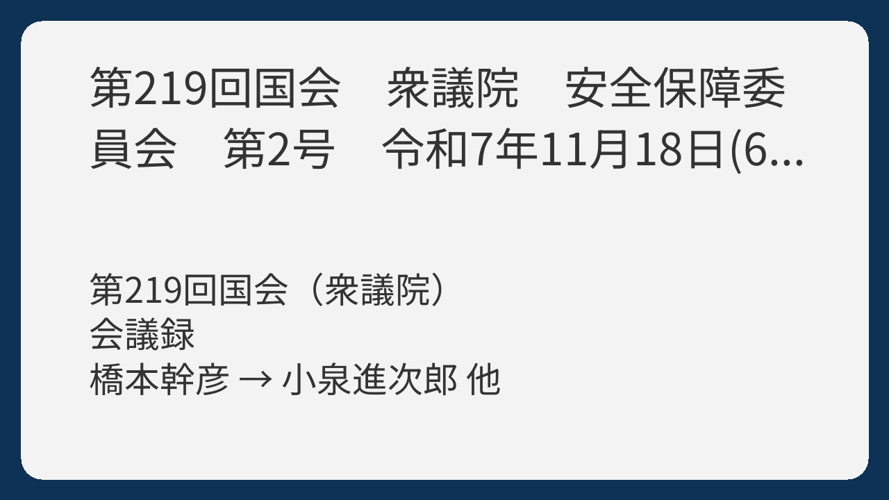 - 戦略的提案: 単なる情報強化ではなく、「国家情報局」の創設という、政府の情報機能を抜本的に強化するための具体的な組織改革の選択肢を提示しており、質問が戦略的かつ先見性を持つことを示しています。