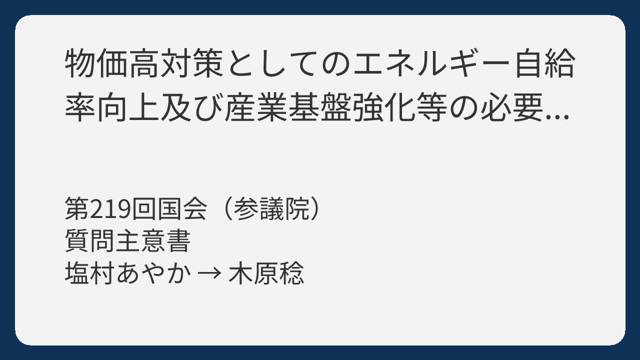 この質問と答弁は、「日本が外国から買うエネルギーに頼りすぎているため、物価が上がりやすい」という問題について話し合っています。塩村あやか議員は、
