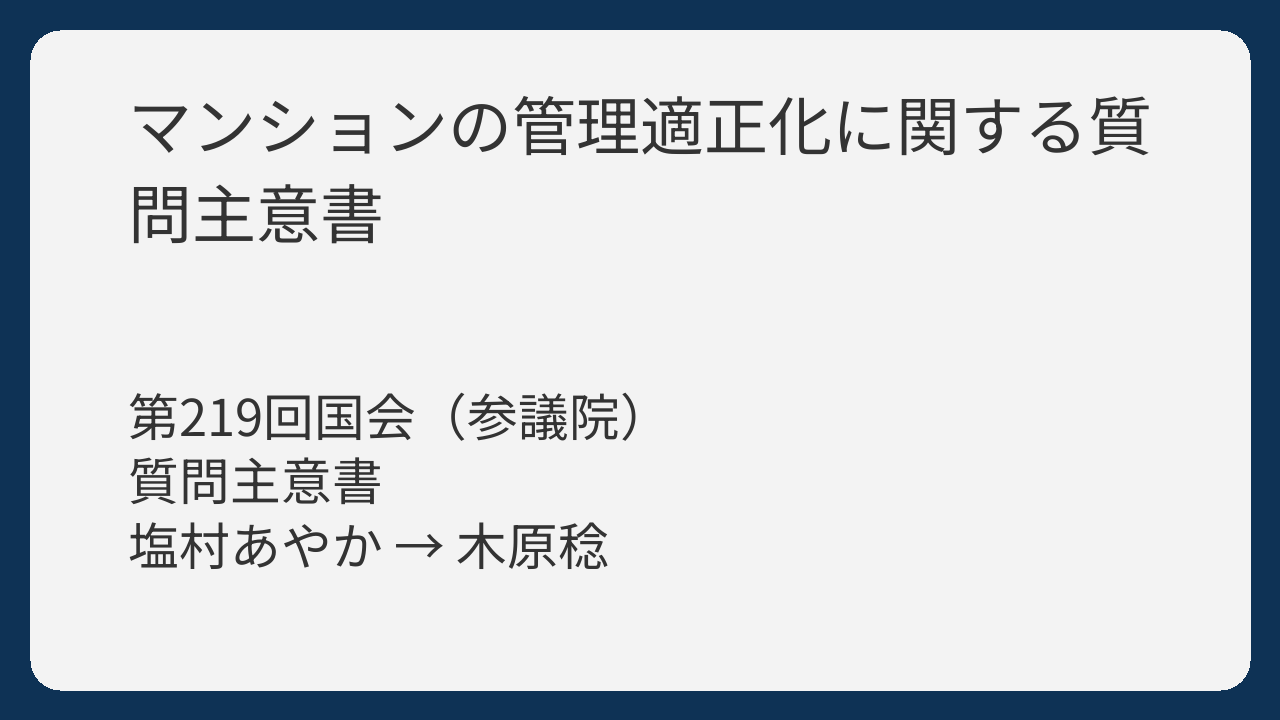 管理がうまく行われないまま放置されると、外壁が落ちるなど危険になり、住人や近所の人に被害が出るおそれがあります。そのため、国はマンション管理をよくするための法律を改正しました。しかし、まだ課題が残っているとして、参議院議員の塩村あやか議員が政府に質問をしました。