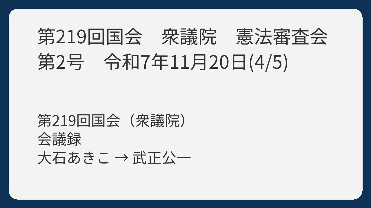 本議論は、前半で河西宏一委員が海外調査の重要な論点(間接規制と表現の自由)を整理・確認し、議論の土台を固めた点では高い価値がありました。しかし、後半の大石あきこ委員の発言は、海外調査報告の内容や、国民投票法の具体的な制度設計といった論点から逸脱し、特定の過去の政治問題(Dappi問題)と憲法審査会の運営に対する批判に焦点を当てています。これは、憲法審査会の場を借りた政治的な主張と批判であり、調査報告に基づく制度論的な議論の継続性という点では生産性を下げたため、「良い議論」ではなく「まあまあ良い議論」に留まると評価します。