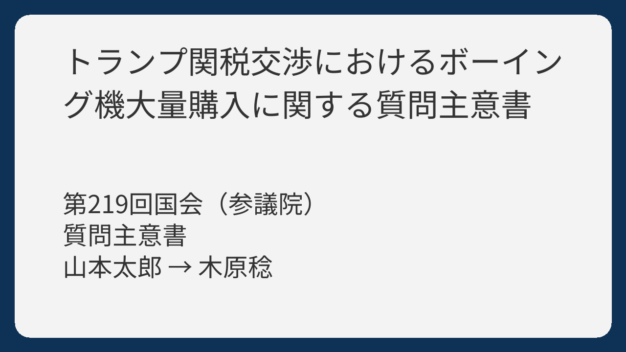 この質問主意書では、日本がアメリカとの交渉の中で、ボーイング社の飛行機を100機買うことになったというニュースについて、その背景や安全性、責任問題について山本太郎議員が質問しています。