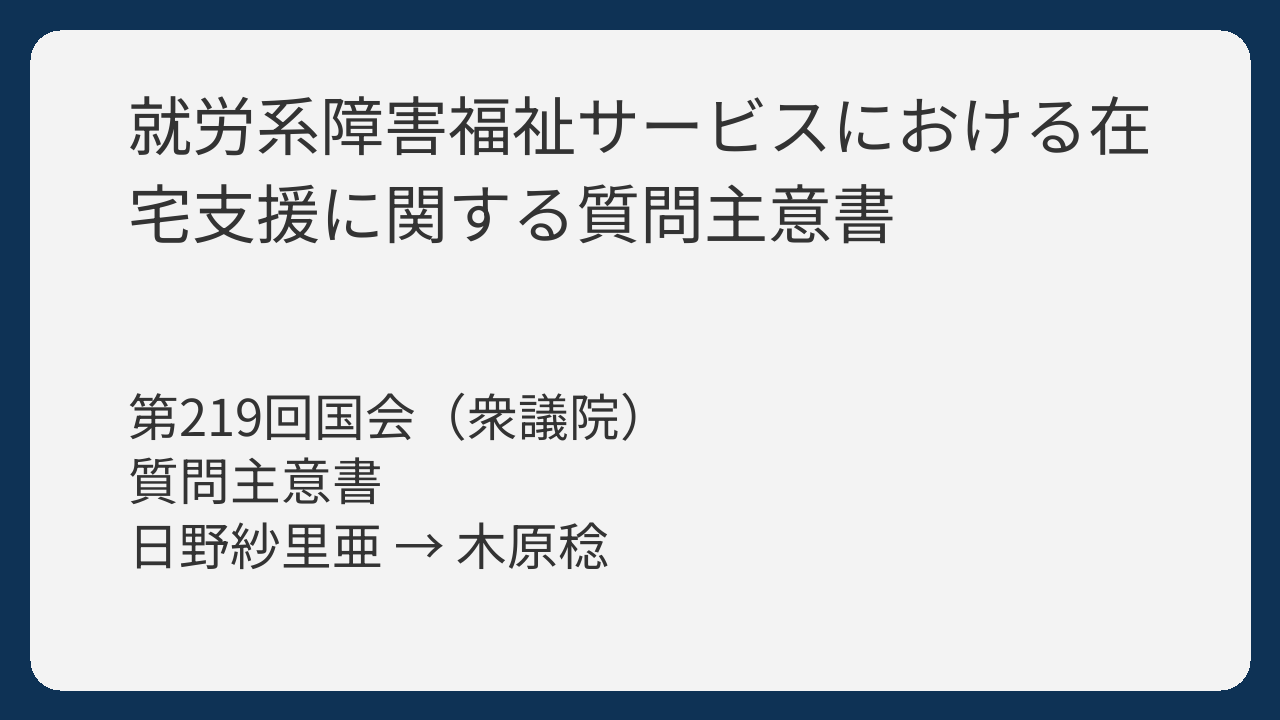 しかし質問の弱点もあります。「地域差が生じている」ことが必ずしも問題であることが明示されていません。答弁書でも指摘されているように、市町村が個別に判断する結果として差が生じることは、むしろ適切な判断の現れである可能性があり、その点についての議論が不足しています。また、「知的障害のある者は在宅での作業が困難」という排除事例を「報告されている」と述べていますが、その具体的な数や実態が示されていないため、問題の規模感が不明確です。さらに、提案した「新たな在宅支援制度」の詳細な仕組みや財政的根拠が明確でなく、実現可能性の検証が不足しています。