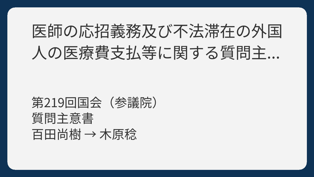 この国会質問では、参議院議員の百田尚樹さんが、医師の応招義務(診療を断ってはいけないルール)や、不法滞在している外国人の医療費の支払いについて、日本政府へ質問し、その答えが木原稔内閣総理大臣臨時代理から出されました。