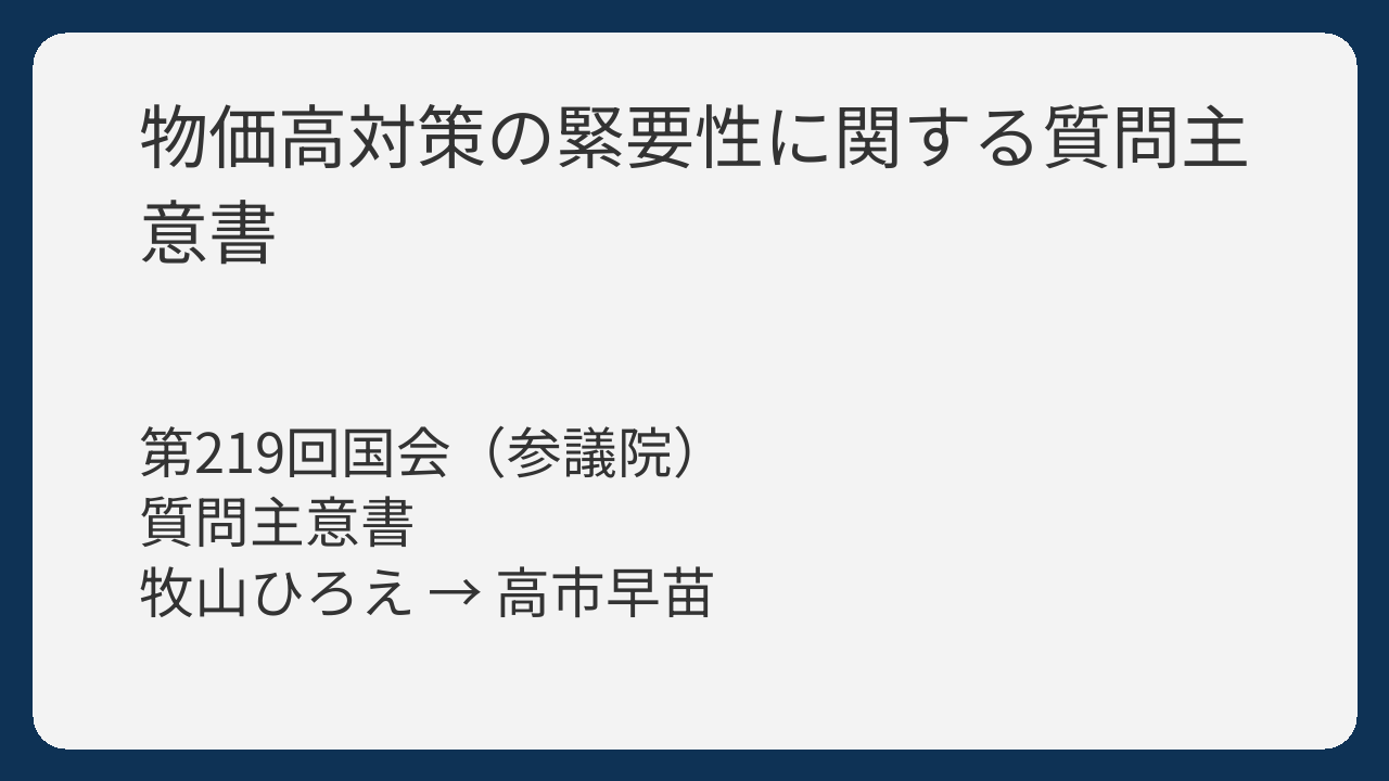 質問の構成も論理的です。現状認識の確認(質問一、二)→具体的な影響の確認(質問三)→政府の決意の確認(質問四)→既存対策の評価(質問五)→今後の方針(質問六)→具体的政策提案の検討状況(質問七)→国際比較と影響試算(質問八)という流れで、一般から具体へ、現状から提案へと展開しています。