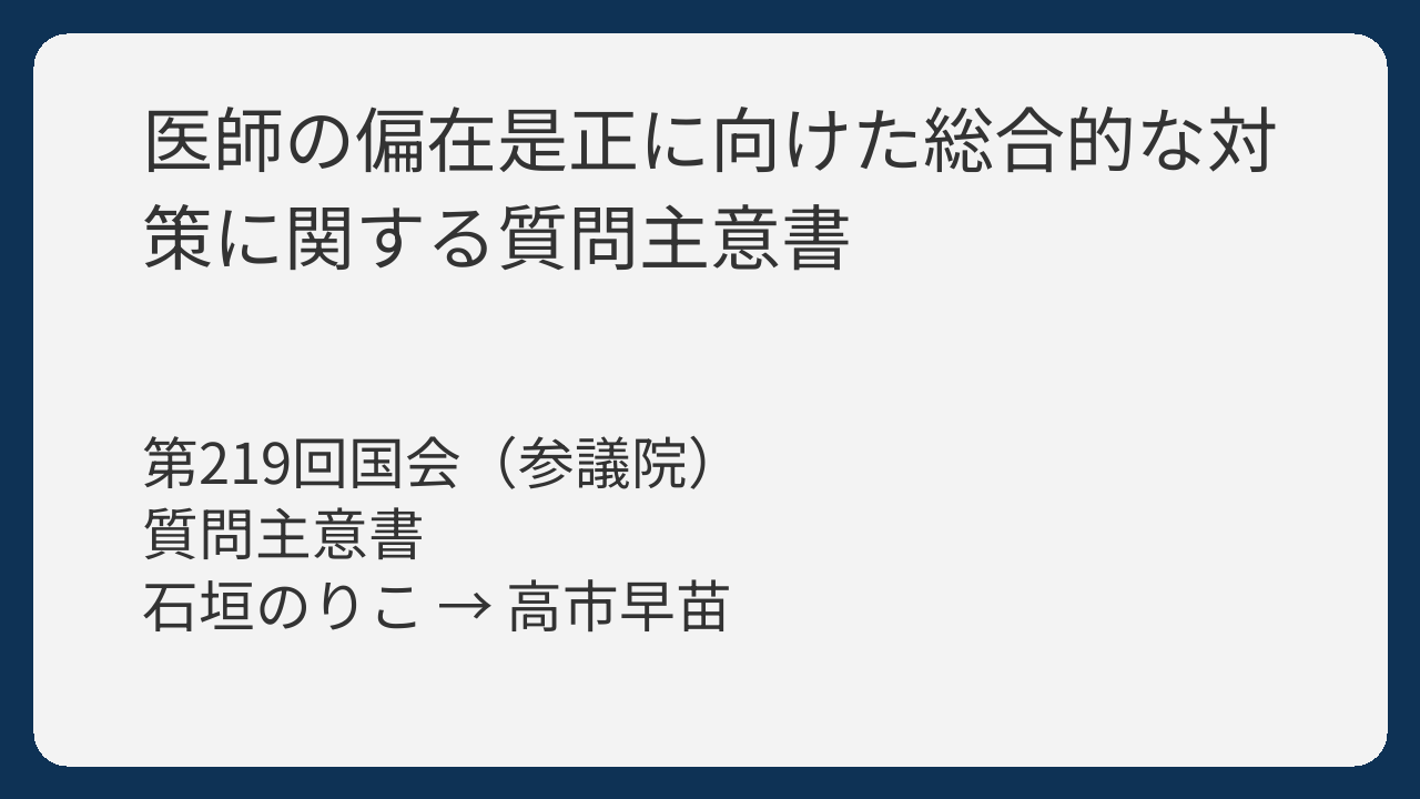 - 答弁全体を通じて、医師偏在問題の深刻さに対する認識や、解決に向けた具体的な数値目標、予算措置、実施スケジュールなどが示されていません