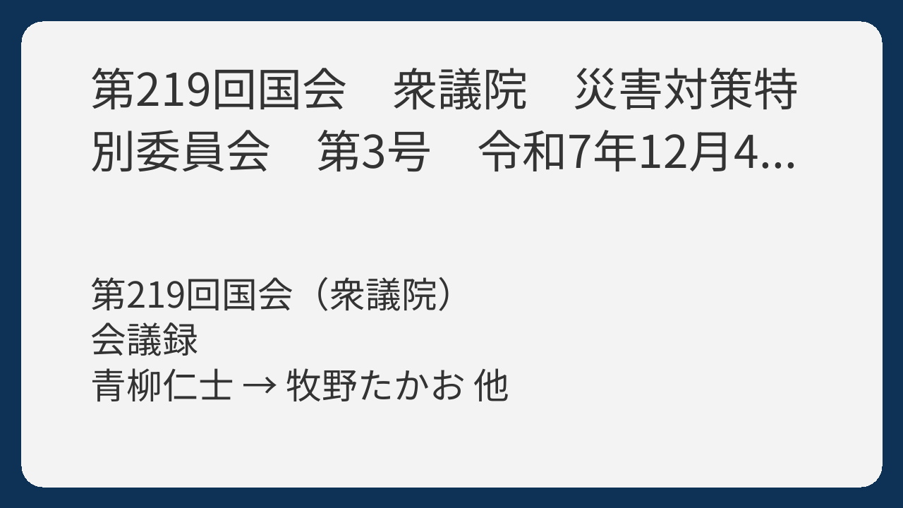 - 牧野国務大臣(防災庁設置準備担当)は、市町村が主体の原則(地域特性に応じた対応)を維持しつつ、防災庁の役割を「事前防災の徹底」や「市町村防災体制の底上げ」と説明しましたが、質問者が指摘した「主体性の維持が広域災害で生む弊害」や「マニュアルのバラつき」という構造的な課題への具体的な処方箋(例えば、国による統一的なマニュアルの作成・義務化など)には言及していません。