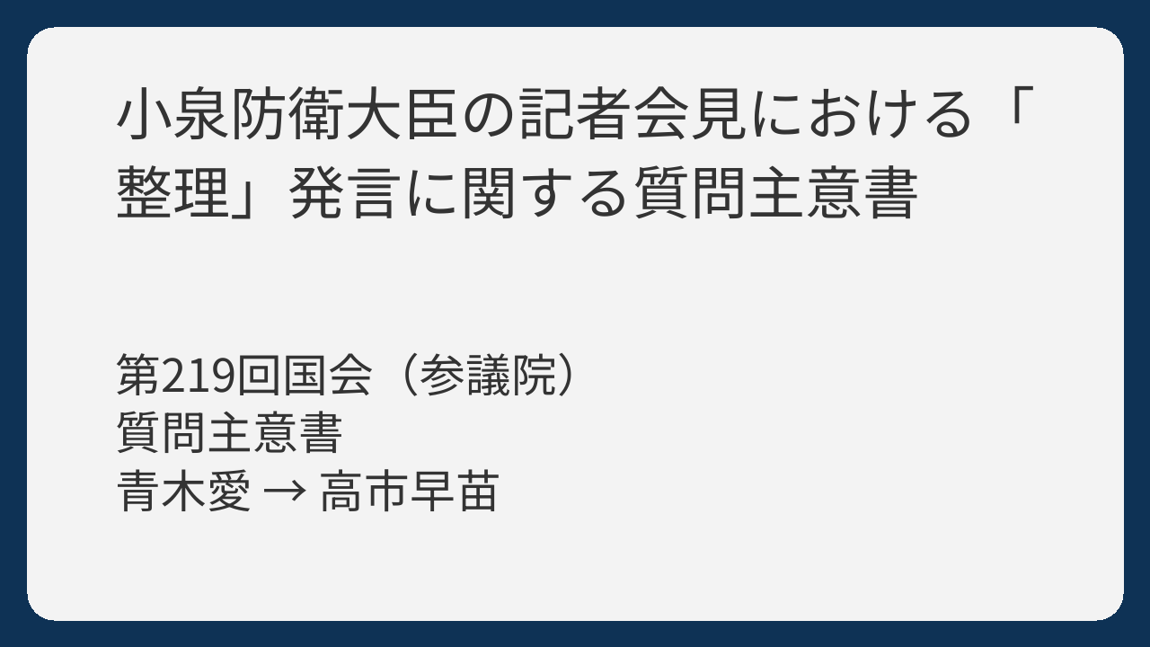 青木愛参議院議員は、小泉進次郎防衛大臣が記者会見で「自衛隊の活動内容について、どこまで外に出せるかを部局ごとに整理している」という発言をしたことを受けて質問しました。青木議員は、防衛省や自衛隊が情報の出し方をどのように決めているのか、また、その経緯や結果が文書として残るのかなど、具体的な運用状況について確認しようとしました。