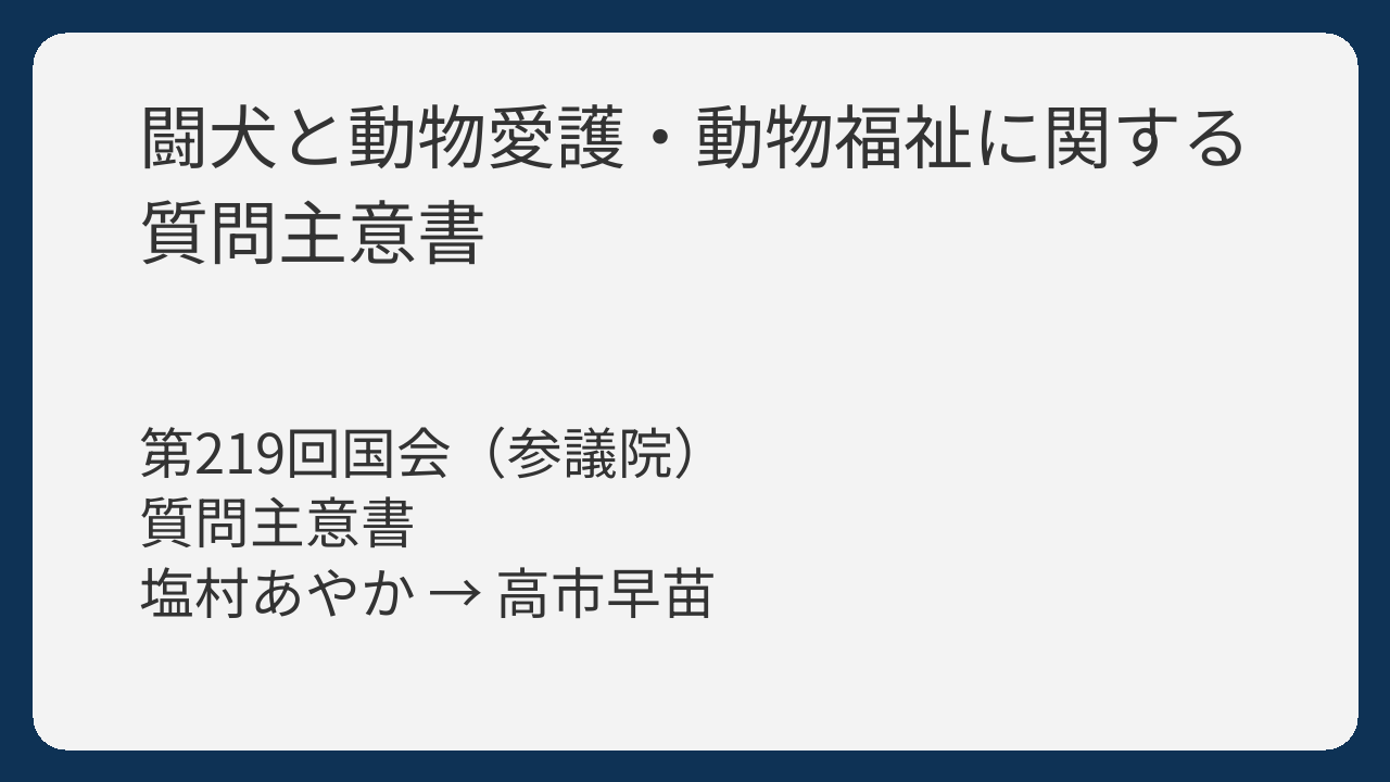 この国会質問は、塩村あやか参議院議員が、闘犬と動物愛護・動物福祉について政府の考えを詳しく尋ねた内容です。日本の一部地域では、伝統行事や文化として闘犬が行われてきましたが、動物を戦わせることへの批判や、その防止・取締りのための条例を定めている自治体もあります。