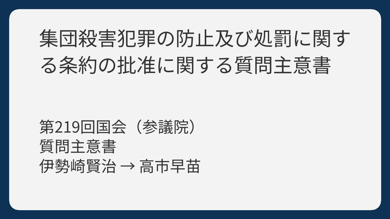 • 質問者は参議院議員の伊勢崎賢治で、ジェノサイド条約の内容が国際的なルール(慣習国際法)として成立しているか、そして日本の法律でそれらをカバーできるかを尋ねました。