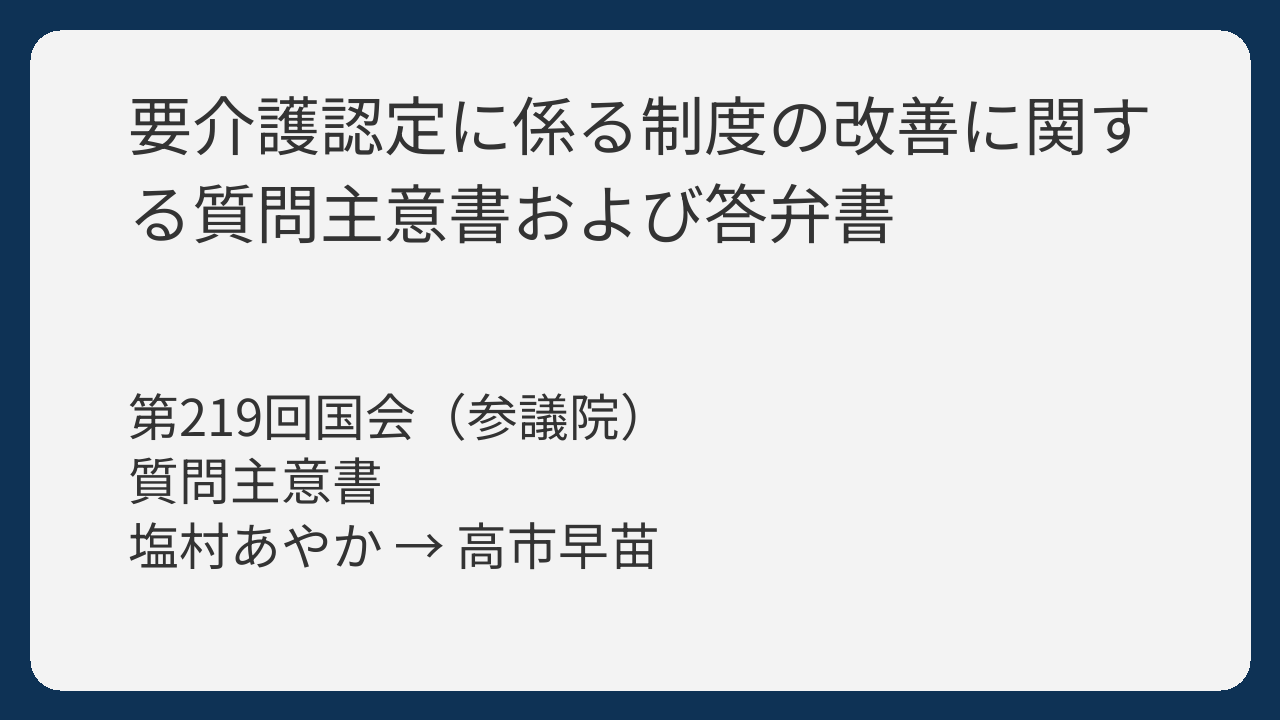 塩村あやか議員は、介護が必要な人に国がどのように「要介護認定」をしているかについて、さまざまな課題があると指摘し、政府に改善策を質問しました。今のやり方が15年以上ほとんど変わっていないことを問題視し、現場の人たちが感じている困難や不便についても取り上げています。
