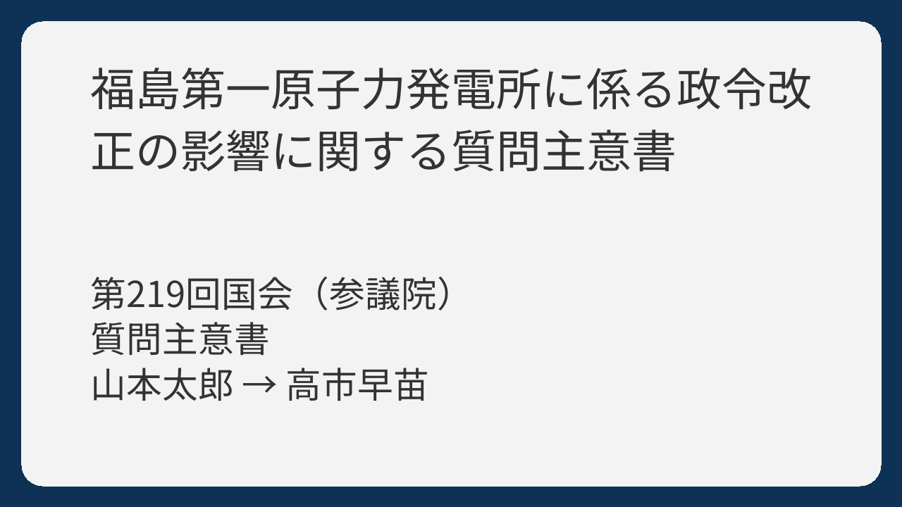 参議院議員の山本太郎さんは、福島第一原子力発電所(福島第一原発)で行われた法律と政令の一部改正について、政府に質問しました。主な内容は、法律の一部が福島第一原発にだけ適用されなくなった理由や、それによる手続やチェック体制がどう変化したのかというものです。