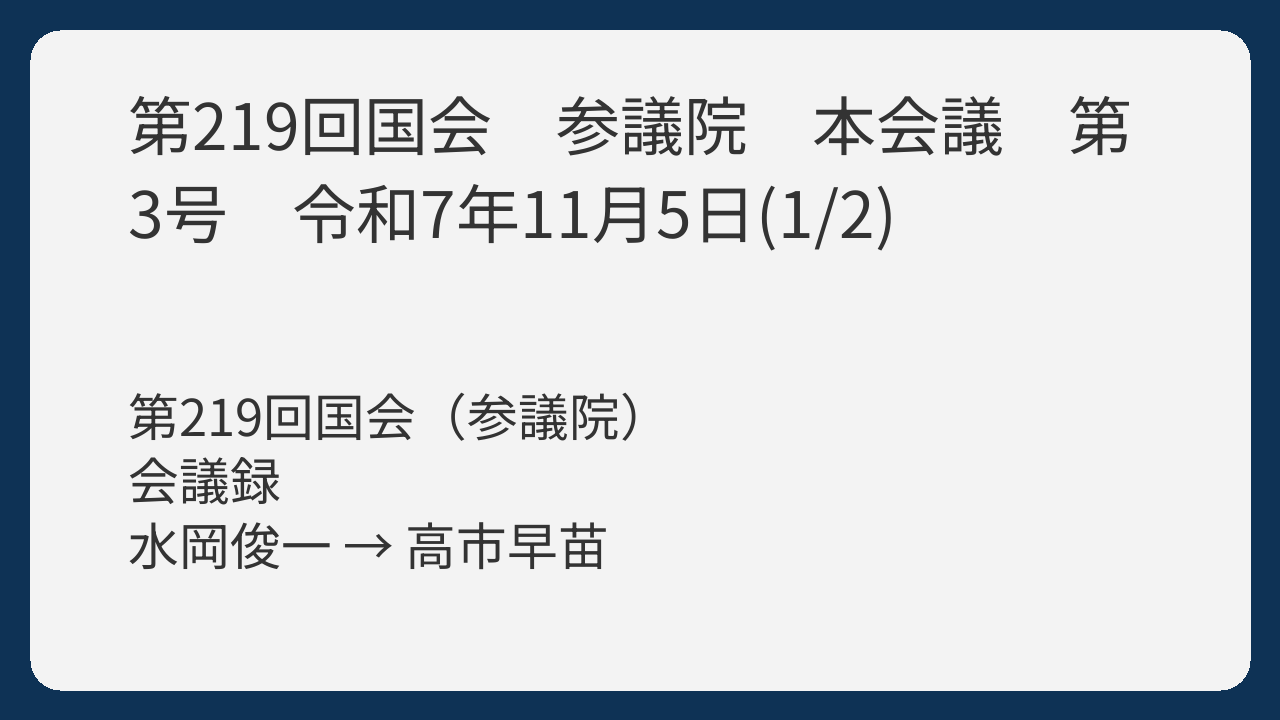 水岡議員は、政治と金の問題(裏金問題、森友学園問題)、働き方と少子化の関連、教育・研究予算の確保、人権・外交、拉致問題、危機管理と憲法改正など、広範な分野にわたり、国民の関心が高い重要な論点を網羅的に質問しています。高市総理は、これらの質問に対して、内閣の基本的な姿勢や政策方針を概ね示す定型的な答弁を返しています。