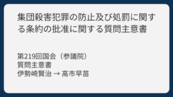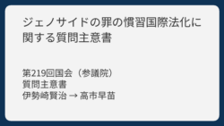 3行解説POINT集団殺害(ジェノサイド)に関する国際的なルールや、日本の法律との関係について質問と政府によるやりとりです。質問者は参議院議員の伊勢崎賢治で、ジェノサイド条約の内容が国際的なルール(慣習国際法)として成立しているか、そして日...