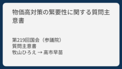 子ども・教育 物価高対策の緊要性に関する質問主意書 3行解説POINT日本で物価が上がっていることについて、特に食べ物の値段が家計に与える影響や、その対策として「食料品の消費税をゼロ%にする」案についての質問と内閣総理大臣の答えのやりとりです。質問は牧山ひろえ議員によるもので、物価高の現状・... 2025.12.24 子ども・教育社会保障経済政策財政・投資貧困