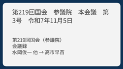 所信表明 第219回国会 参議院 本会議 第3号 令和7年11月5日(1/2) 3行解説POINTこの議論は、日本の政治とお金の問題、森友学園、公務員や研究者・先生の働き方、少子化対策、人権問題、拉致問題、クマ被害、憲法改正など、国のあり方全体についての質問と答弁です。質問者: 水岡俊一議員(立憲民主党)が、裏金問題を... 2025.11.30 所信表明