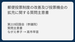 3行解説POINT郵便投票制度や投票機会を広げることについて、手続きの簡素化や対象拡大などの要望と政府の考えについての質疑です。質問者は参議院議員ながえ孝子で、郵便投票を全有権者に開放することやオンライン申請への対応など、投票しやすい仕組み...